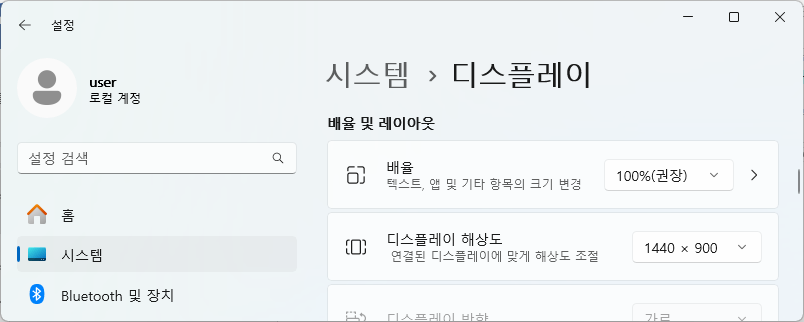 배율 100%로 설정 및 해상도를 1600x900 혹은 1440x900 등 16:9등으로 적절한 해상도로 설정합니다.